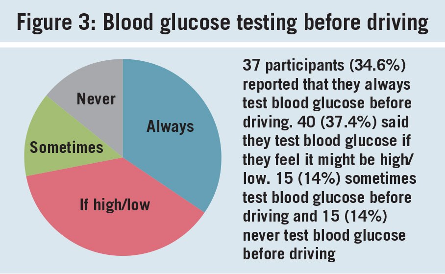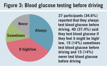 • Of the 36 people who appeared to be aware of the guidelines, only 15 (41.7%) always check their blood glucose level before driving
