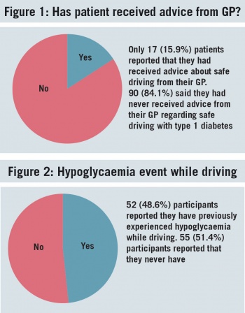 We can see from these results that few patients with type 1 diabetes appear to be aware of the driving licence guidelines for patients on insulin or know how to manage hypoglycaemia appropriately. Most say they have not received safe driving advice from their GP. However, a majority do carry their testing kit in the car. Patients need to be better informed on the driving guidelines and GPs have a major role in ensuring patients have the appropriate information.