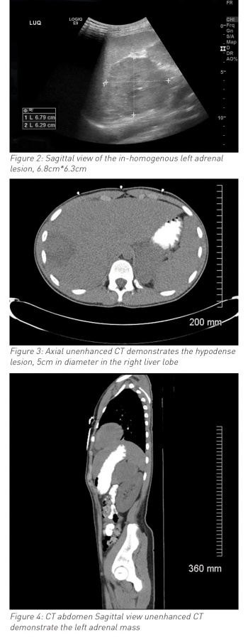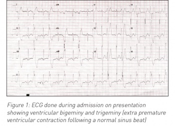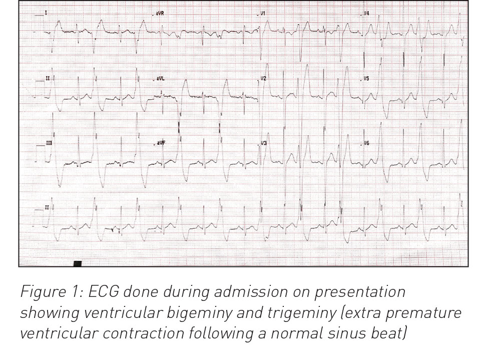 During his hospital stay it was noted that he had an episode of high blood pressure (140/90mmHg) and developed ventricular bigeminy and trigeminy (see ECG in Figure 1). Chest x-ray and echocardiography were normal. Ultrasound and MRI abdomen reported left side suprarenal mass (8cm) and associated liver abscess (7cm x 7cm x 7cm). Urine catecholamines were normal. Liver abscess (abscess grew Streptococcus intermedia) was treated with drainage and with six weeks antibiotics. Paraganglioma was surgically resected successfully three months after initial diagnosis and full evaluation (genetic testing and exclusion of MEN syndrome and von-Hipple-Lindau syndrome). Ventricular bigeminy resolved completely and final diagnosis of non-secreting pheochromocytoma and coincidental liver abscess (likely due to trauma in the past). He was discharged home after full recovery. He is being followed up with regular abdominal imaging; to date, no concerns have been reported.