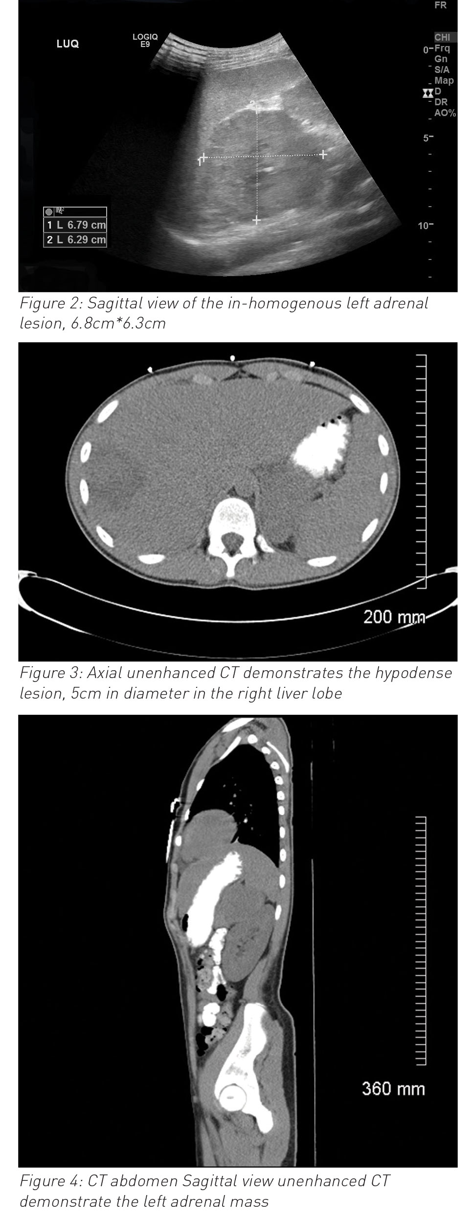 On clinical examination, he was unwell, pale, tachycardia (H.R: 130/min), pain score: 8/10, positive Murphy sign. Blood investigation showed high inflammatory markers with white blood cells of 36.4 x 109/L and C-reactive protein of 252mg/L) normal liver functions test and serum amylase. The working diagnosis of acute cholecystitis established and was commenced in intravenous antibiotics (initially on co-amoxiclav and then switched to cefotaxime) and further radiological investigations were requested.