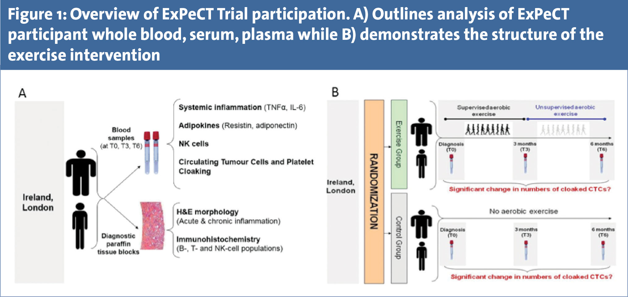 With increasing evidence examining the benefits of physical activity in metastatic PCa patients, there is an emerging need for a comprehensive exercise intervention programme incorporating advanced patients. ExPeCT (exercise, prostate cancer and circulating tumour cells) is a multi-centre randomised clinical trial for men with metastatic PCa, funded by the World Cancer Research Foundation (Clinicaltrials.gov NLM Identifier: NCT02453139). Recruitment for ExPeCT is underway in five Irish sites in conjunction with the All-Ireland Co-operative Clinical Research Group (ICORG) and one UK site (St Guy’s Hospital, London). ExPeCT has a target accrual of 200 participants and once enrolled in the study, patients are randomised into an exercise or control group and followed for a total of six months. The exercise programme consists of three months supervised aerobic exercise, followed by a three month unsupervised home based regime. Aerobic exercise will be based on an increase in heart rate and a range of activities, such as walking and jogging, are utilised. Due to the presence of lower limb metastatic bone lesions in these participants, equipment such as upper limb ergometers are used to accommodate any discomfort caused by metastatic burden. Participants randomised to the control group continue their standard care.