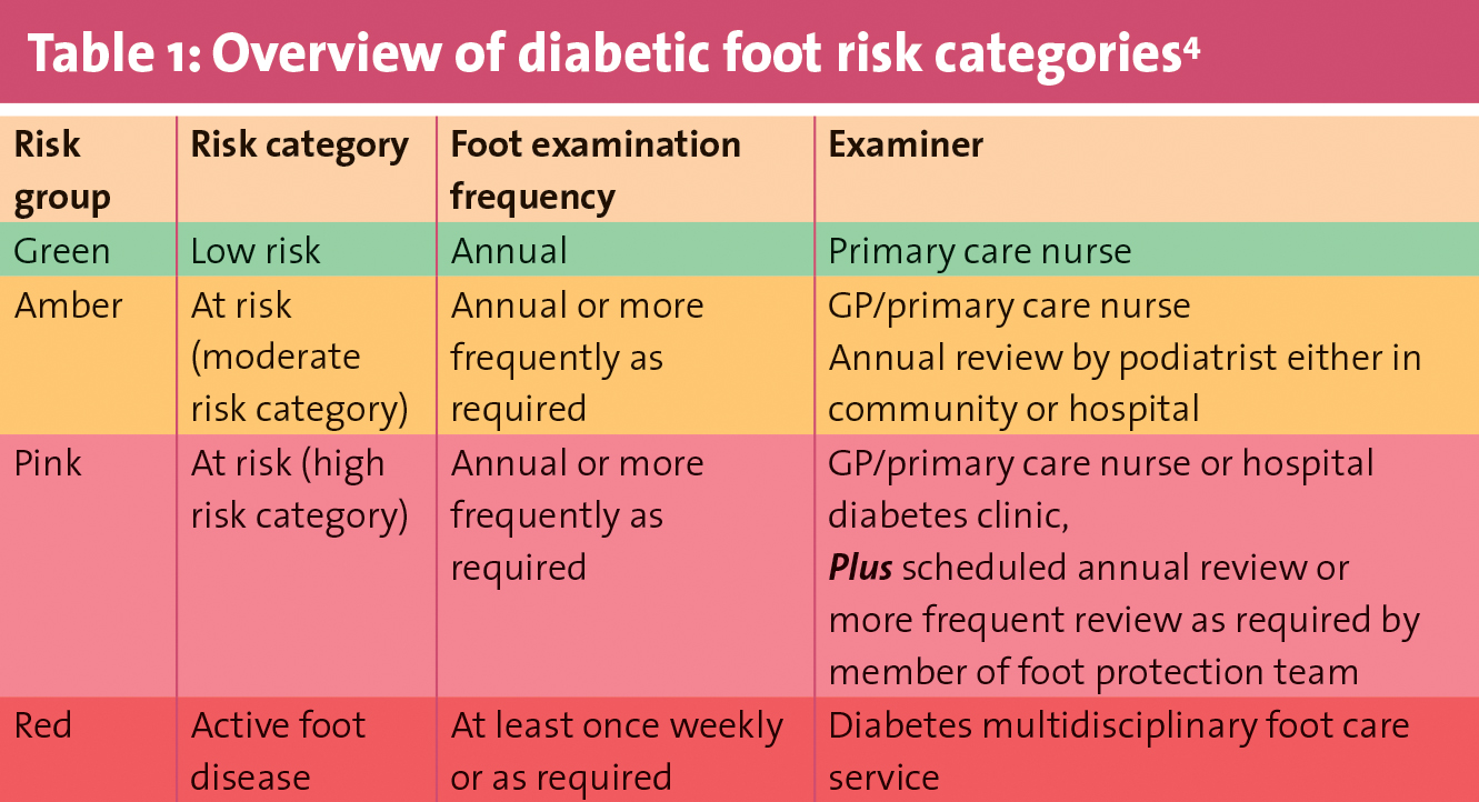 Another outcome since the implementation of the model of foot care is that education of practice and community nurses has taken place so that they can identify low-risk feet and those that may have complications. Leaflets with information about at-risk feet have also been produced to support patients.
