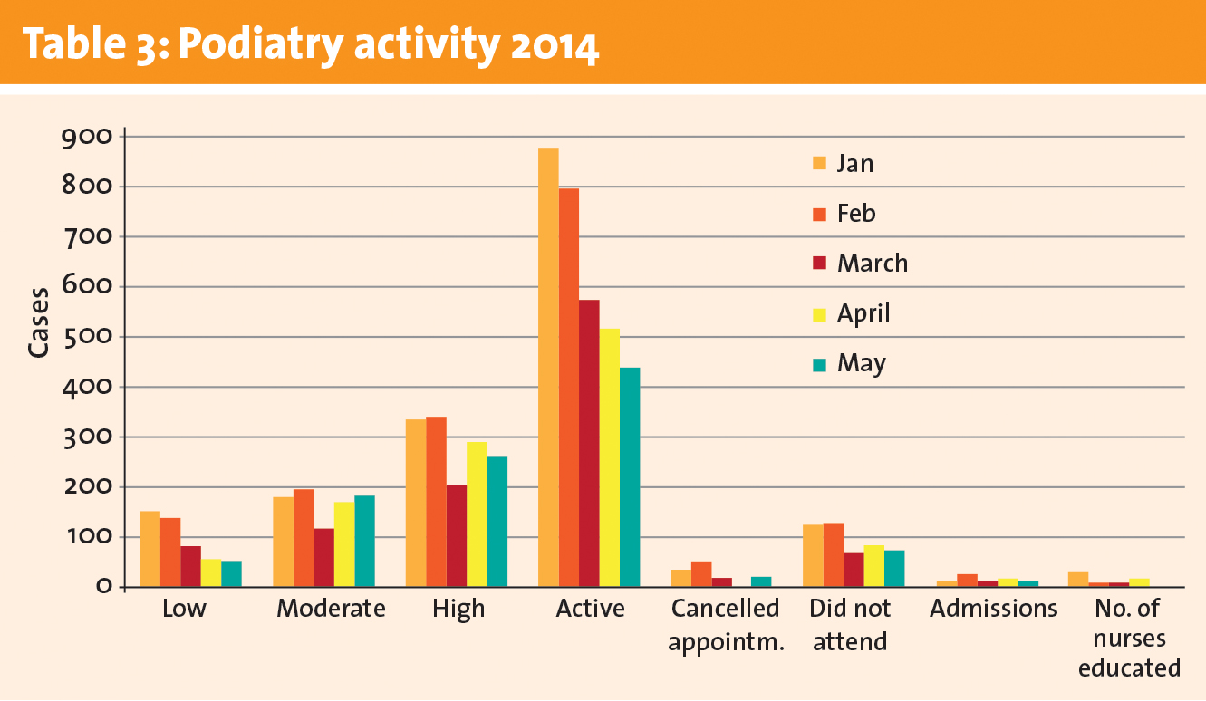 A simple audit that was sent out to the 16 HSE podiatrists in 2014 shows that 70% of the podiatrists’ time is taken up by seeing those patients with active foot disease and high-risk foot, with very little time spent on seeing patients with moderate or low-risk foot (see Table 3).