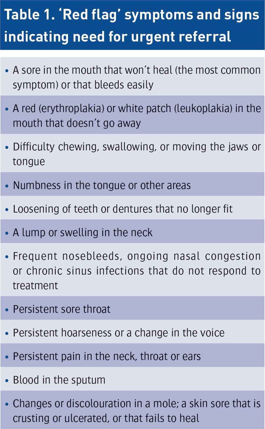 Some head and neck diseases, eg. thyroid cancer, have an excellent prognosis however, unfortunately, two-thirds of all our squamous cell cancer patients present with advanced disease at the time of diagnosis. If these patients fail our first-line of therapy, their prognosis is often very challenging. Like any great science, medicine depends on the delivery and dissemination of knowledge to drive progress. Initial clinical consultations with patients involve a thorough history and detailed examination in an effort to define the clinical problem. Patients with cancers of the head and neck have a large variety of symptoms and signs according to the subsite of the disease. Table 1 highlights the main ‘red flag’ symptoms and signs indicating the necessity for urgent referral.