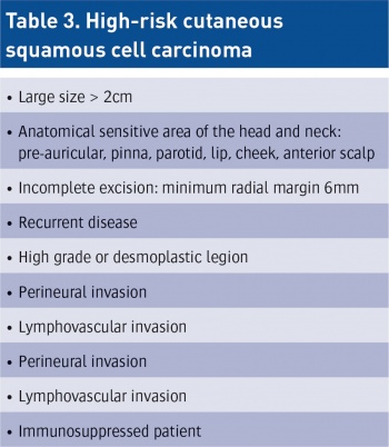 SCC is more likely to spread. It usually presents as a hard lump with a scaly top but may also form an ulcer. High-risk squamous cell carcinomas of the head and neck must be recognised as a separate disease to standard cutaneous squamous cell carcinoma. High-risk SCC includes all of the risk factors in Table 3.