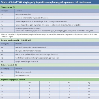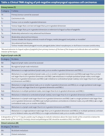 Oropharyngeal cases account for approximately 10% of HNSCC.7 Worldwide, there were an estimated 85,000 new cases of oropharyngeal SCC in 2008. Within the oropharynx, 88-98% of cases arise from the tonsils or base of tongue.8,9 However, determining the exact site of origin, particularly in larger tumours, can be challenging and lead to misclassification. The recent 8th edition of the American Joint Committee on Cancer (AJCC) cancer staging manual has recognised the shift in head and neck cancer trends by acknowledging the emerging role of HPV; the new clinical staging system for oropharyngeal SCC is shown in Tables 1 and 2, with a separate staging system for p16-positive cases.