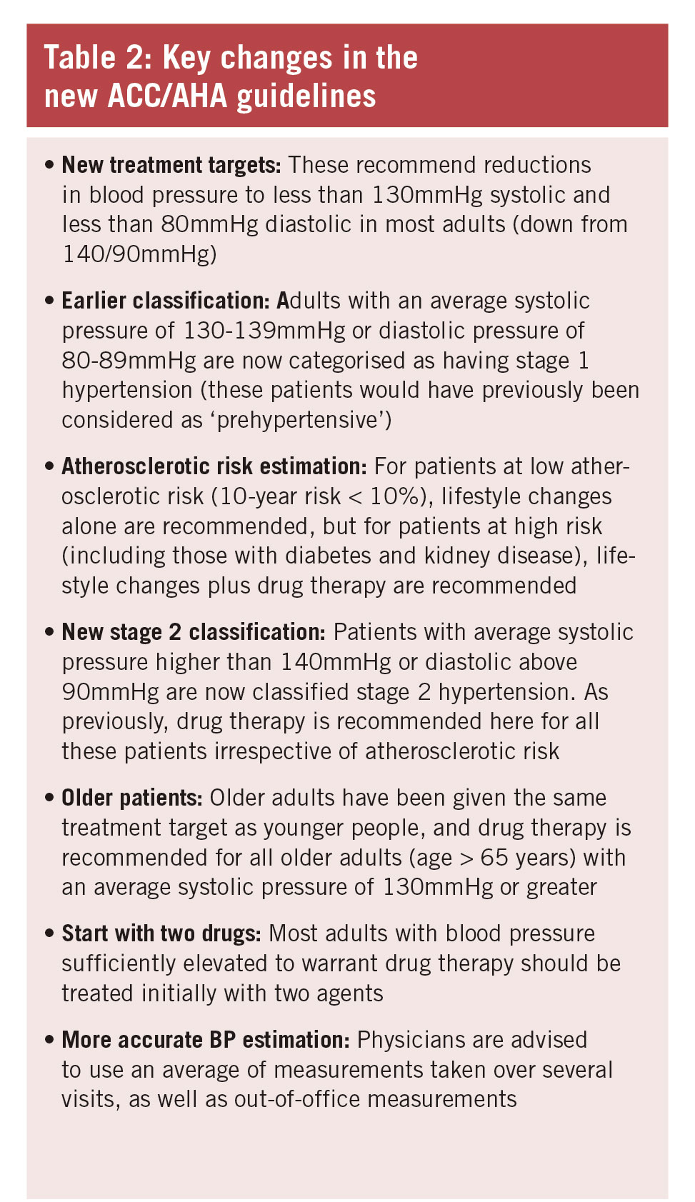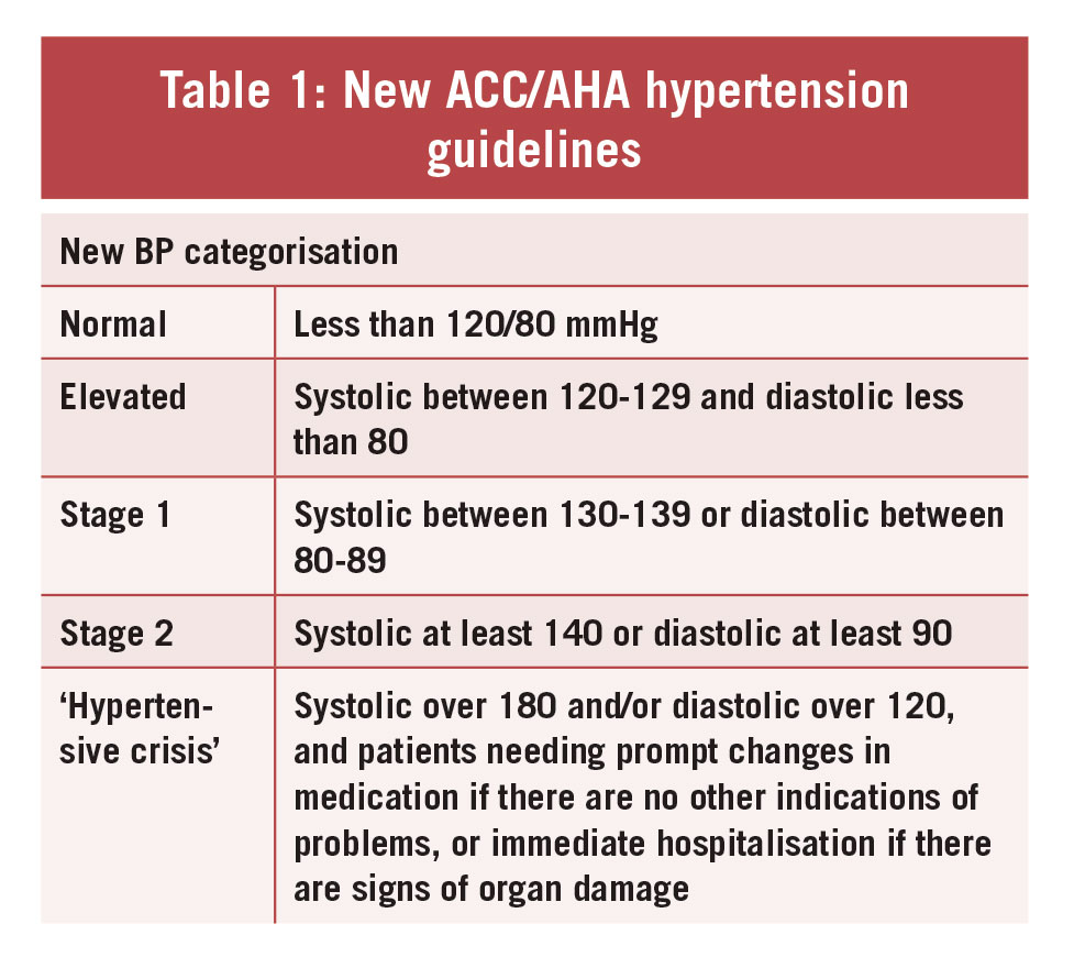 Summarising the main thrust of the guideline changes, the ACC said high blood pressure should be treated earlier with lifestyle changes and in some patients with medication – at 130/80mmHg rather than 140/90 – under the new guidelines (see Tables 1 and 2).