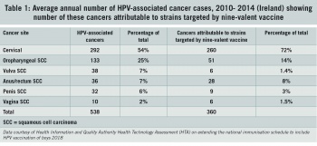 Of the 538 HPV-associated cancers reported per year, 406 cancers are attributable to HPV infection. Of these cases, 307 are attributable to HPV 16 and 18 (targeted by the current four-valent HPV vaccine) and a further 53 cases are attributable to HPV 31, 33, 45, 52 and 58 (additionally targeted by the nine-valent HPV vaccine).