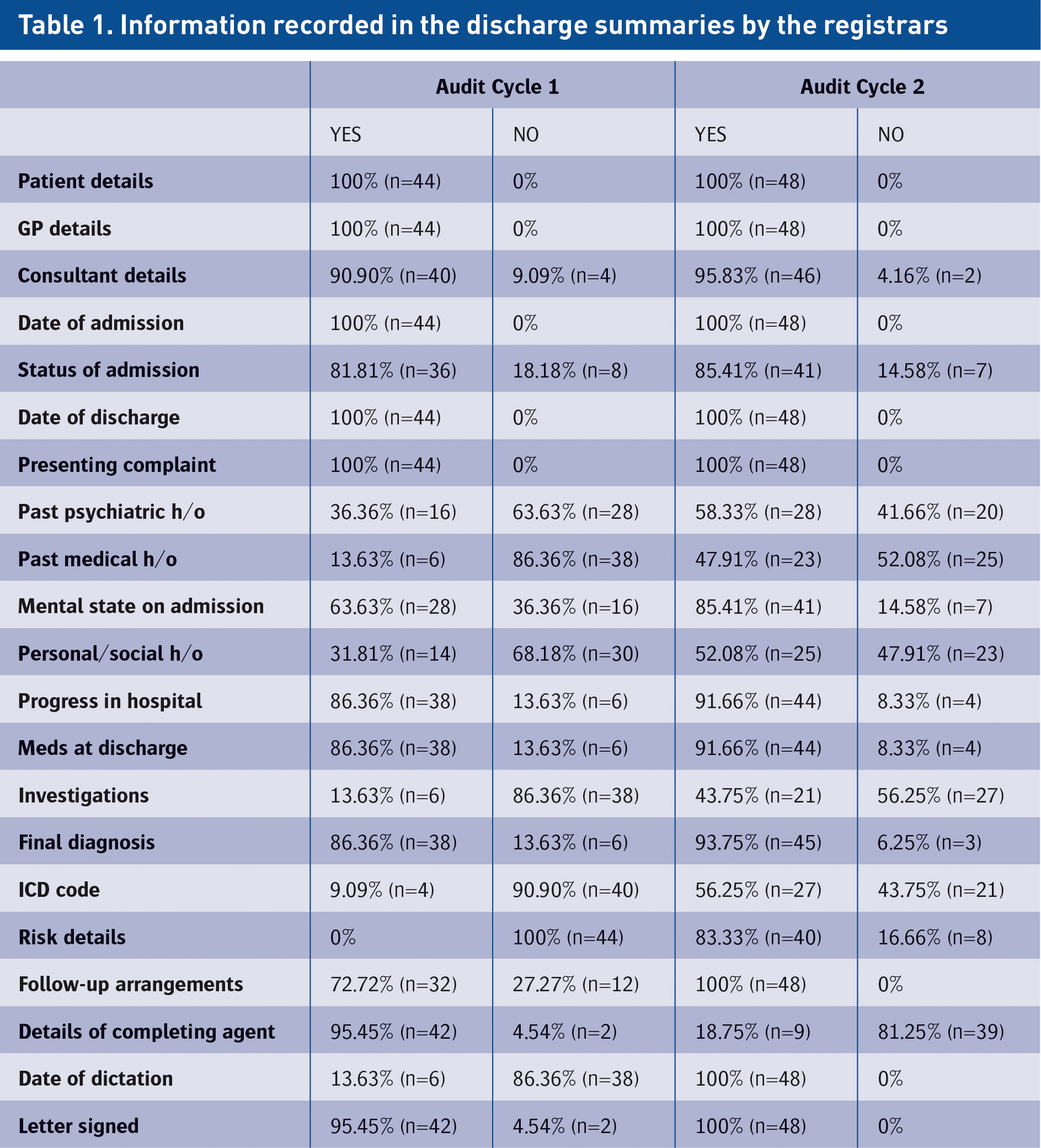 The summaries from case notes of 44 patients who were discharged from the acute adult psychiatric wards, over a period of three months, were obtained. Data was collected while leaving enough time for the discharge summaries to be filed in the respective case notes. In the next intake of NCHDs in the psychiatry department, the new registrars and senior house officers were briefed on the audit by the lead author. This included feedback of the results from the first cycle of the audit, focusing mainly on the areas for improvement, along with reiteration of the local guidelines. Clinicians were encouraged to adhere to these guidelines in an attempt to improve quality of discharge summaries.