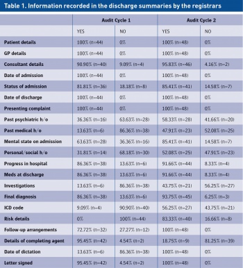 Our aim was to examine and attempt to improve the recording of information within psychiatric discharge summaries in an adult psychiatry department, by means of audit and feedback.