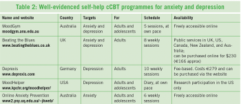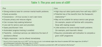 Alongside this good evidence, the UK’s National Institute for Health and Clinical Excellence (NICE) recommends cCBT as a low intensity treatment for anxiety and depression that can be used in primary care.11 For the pros and cons of cCBT see Table 1.