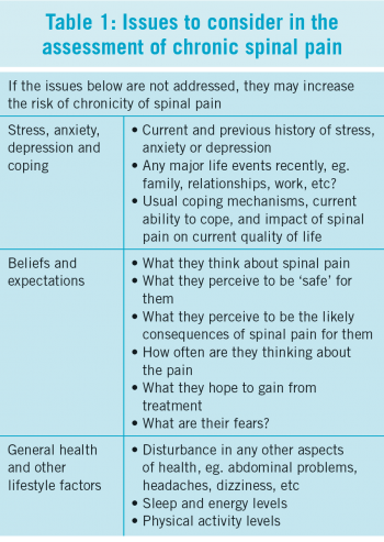 Similar to any patient presentation, screening for the presence of any ‘red flag’ pathologies which may require specialist referral is essential.32 Thereafter, a detailed subjective history is critical, and provides greater insight than the physical examination. The established relationship between the primary care clinician and patient can also provide useful insights into the patient’s life. A guide to some issues worth considering in the assessment of spinal pain is provided in Table 1. In particular, determining if changes in any of these factors coincided with the onset of (or an increase in) spinal pain is very relevant.