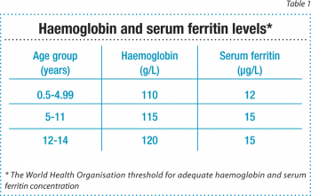 The WHO threshold for adequate haemoglobin and serum ferritin concentration (see Table 1) can be used as a reference guide.8 Serum ferritin can be a useful marker of iron stores which may be deplete before the development of iron deficiency anaemia.