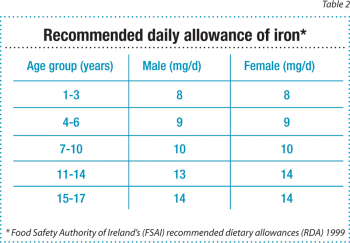 The Food Safety Authority of Ireland’s recommended dietary allowances (RDA) 1999 for iron9 are described in Table 2. The RDA’s describe the amount of iron that should meet the nutritional needs of practically all healthy individuals.