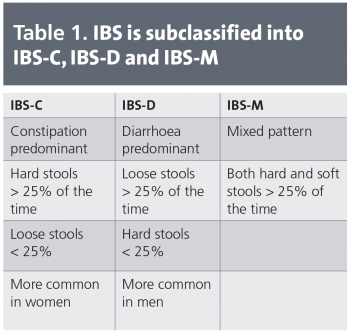 Bloating, distension and disordered defecation are commonly associated features (in some languages, the words ‘bloating’ and ‘distension’ may be represented by the same term).1 It can be subclassified into IBS-C (constipation predominant), IBS-D (diarrhoea predominant) and IBS-M (mixed stool pattern), see Table 1.