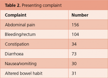 At the time of presentation, the mean duration of symptoms was 14 days (ranging between one and 180 days). Ninety-two cases (30%) displayed more than two symptoms. Of 305 patients, 16 (5.2%) had a family history of bowel cancer. Ten patients were on non-steroidal anti-inflammatory drugs (NSAIDs)/steroids.
