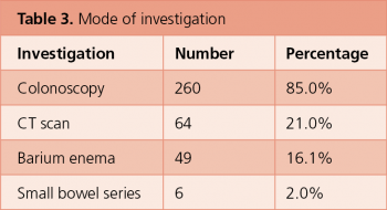 In this study, 260 patients (85%) had a colonoscopy carried out. The findings on colonoscopy were: