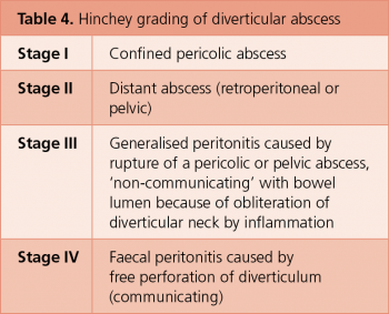 The indications26 for emergency colonic resection include generalised peritonitis, uncontrolled sepsis, visceral perforation, acute clinical deterioration and colonic obstruction. The optimal surgical approach to complicated diverticular disease remains controversial.27
