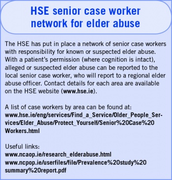 Furthermore, the Irish population is ageing – the number of people over 65 will reach 33% of the population by 2041.6 Elderly people who are physically abused or who experience caregiver neglect have three times the mortality of those never abused.7 Abuse represents a widespread problem with serious consequences: for these reasons elder abuse was recognised as a ‘hot topic’ at the 2011 annual general meeting of the ICGP.
