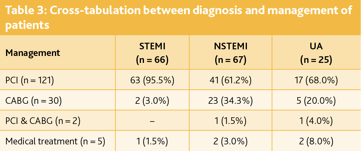As expected, most STEMI patients were managed by primary PCI (95.5%) with only 3.0% requiring CABG and one case being conservatively managed with medical treatment alone (1.5%); 61.2% of NSTEMI patients were treated by PCI, 34.3% by CABG, 3.0 % by medical management and only one patient undertook combined PCI and CABG.