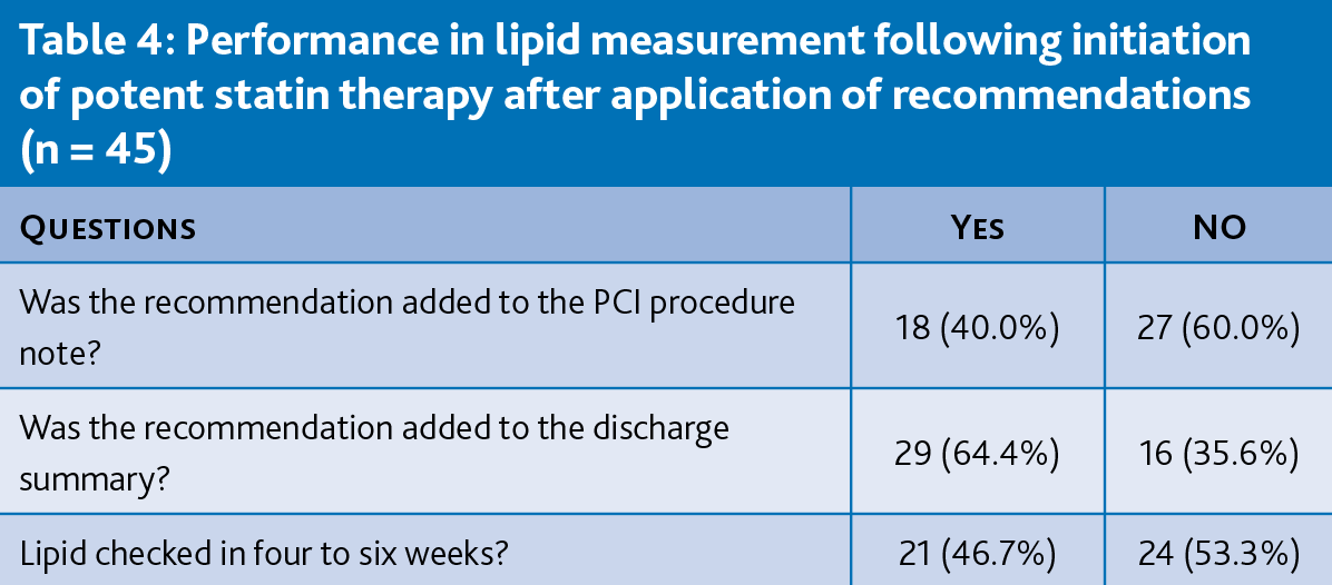 A summary of lipid measurement performance before and after implementing the recommendations showed improvements in some areas, such as reporting in the discharge summary and checking lipids in four to six weeks. However, there was still a lack of adherence to recommendations, particularly in the written procedure of treatment.
