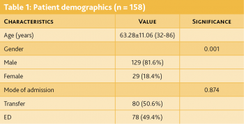 The age of the participants ranged from 32 to 86 years with a mean age of 63.28 years. The majority of patients were male (81.6% versus 18.4%, p < 0.001). The mode of admission was transfer (TF) (50.6%) or via the emergency department (ED) (49.4%) with no significant statistical difference between them (p = 0.874) (see Table 1).