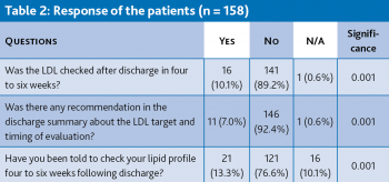 Lipid assessment after discharge four to six weeks post-sentinel event was only observed in 16 (10.1%) patients; recommendations regarding the timing of lipid evaluation and target goal was revealed in 11 (7.0%) patients, while 21 patients reported that they were only instructed to check their lipid profile in four to six weeks (13.3%) (see Table 2).