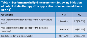 Guideline recommendations were added to the PCI procedure note for 40% of patients, while 60% did not have this addition. In the discharge summary, recommendations were included for 64.4% of patients, and omitted for 35.6%. Regarding lipid profile checks within four to six weeks post discharge, 53% did not undergo the check, while 46.7% did (see Table 4). Notably, only 13.3% of patients without a lipid profile evaluation by their doctor had a discharge report containing guideline recommendations.