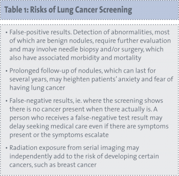 In theory, screening for lung cancer has the potential to reduce mortality and morbidity. There are potential harms, however, attached to screening as well as potential benefits. These risks need to be appreciated in order to determine the benefits (see Table 1)