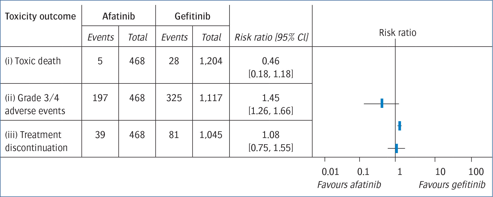 Figure 2. Risk of treatment-related toxicities from EGFR tyrosine kinase inhibitors afatinib and gefitinib(click to enlarge)
