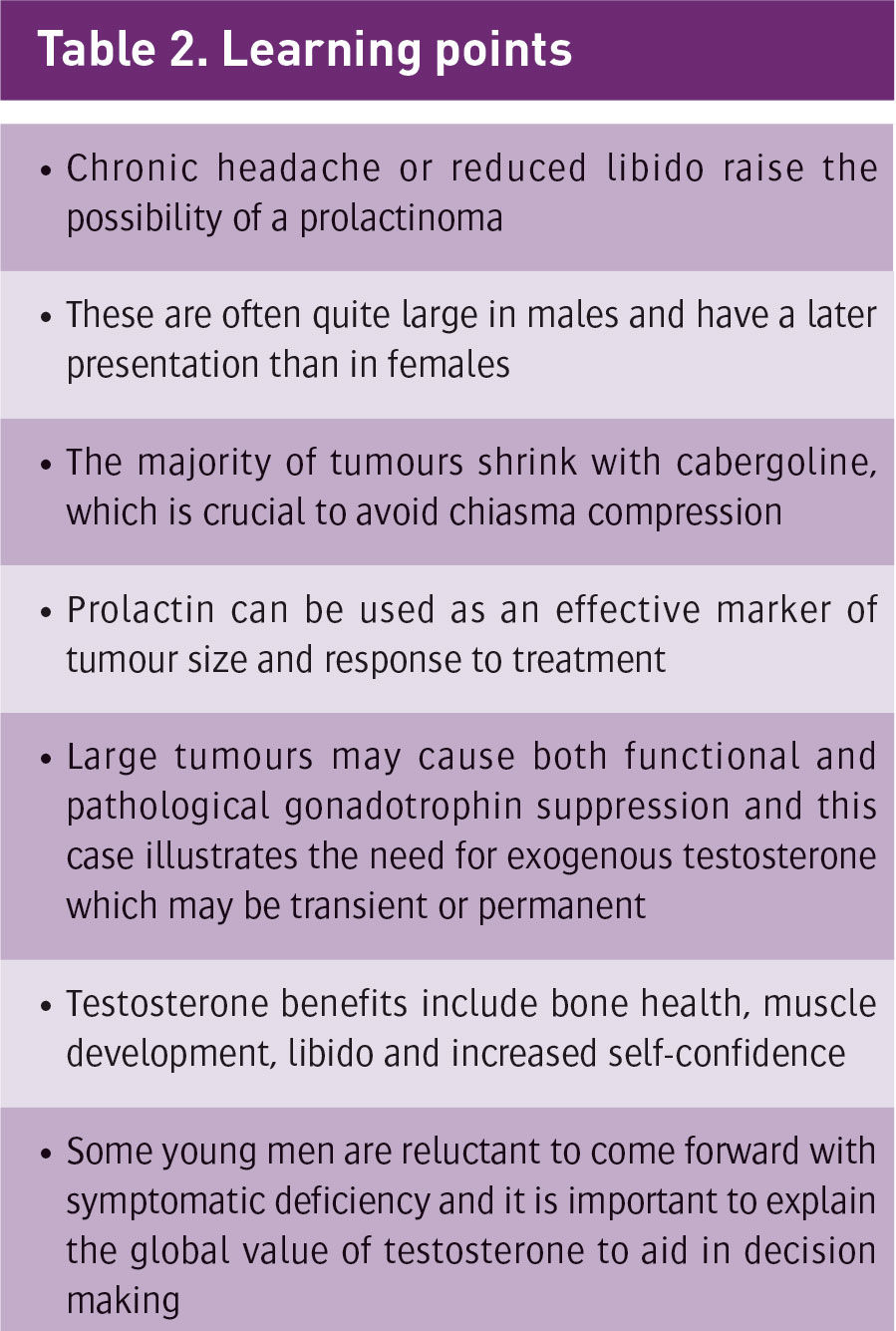 A patient with a macroprolactinoma had good tumour shrinkage with high-dose cabergoline. However, testosterone levels and libido did not improve until intramuscular Sustanon rather than transdermal testosterone was employed.