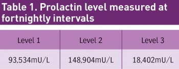 Repeat MRI brain had shown a 17 x 23mm adenoma much reduced in overall size in the three months since treatment commencement and prolactin fell to 3,721mU/L.