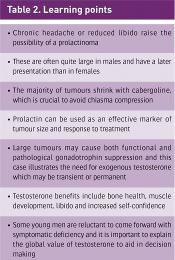 He was commenced on cabergoline, which was built up to 1mg twice weekly. Testosterone replacement was delayed pending control of the prolactin.