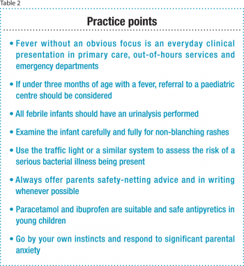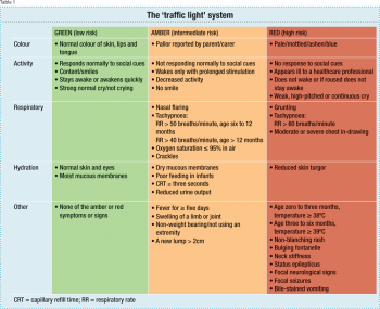 Serious bacterial illness is most unlikely in a smiling infant. The NICE guidelines on the febrile child established the ‘traffic light’ system for risk stratifying children.7 They divide them into high, intermediate or low risk of having a serious bacterial infection and suggest recommendations on appropriate management of children in each category. Table 1 lists the signs and symptoms to look out for.