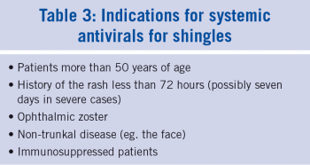 There is some evidence that treating shingles with oral antivirals at an early stage may be lessen the incidence and severity of postherpetic neuralgia and so systemic treatment should be considered for shingles, particularly in those over the age of 50 once it can be started within 72 hours from the first appearance of the rash (see Table 3). There is some limited evidence that systemic treatments with antivirals may be effective even up to seven days after the onset of the rash, particularly in the high risk groups.1