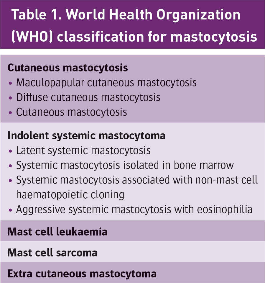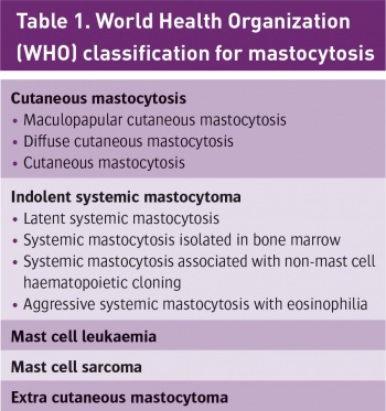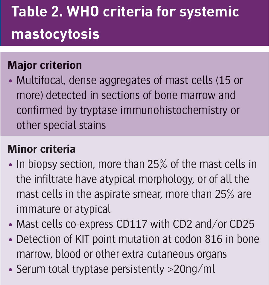 She gave a history of a cutaneous rash for at least 10 years, small pinkish light brown papules which become erythematous with irritation or sun exposure. She also had a history of intermittent flushing and urticaria. Her diagnosis was based on pathological examination of a skin biopsy which demonstrated a mast cell infiltrate in the upper dermis consistent with urticaria pigmentosa. She also had elevated tryptase level, a marker of mast cell degranulation released in parallel with histamine. She had negative CKIT D816V mutation, which was reassuring as far as risk to future offspring was concerned.