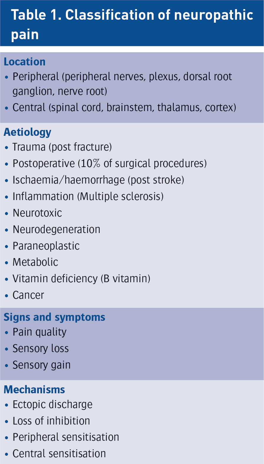 Damage to the nerve pathways can occur at any point from the peripheral sensory receptors to the neurons in the somatosensory cortex in the brain resulting in neuropathic pain. The location and nature of the causative lesion may not be apparent in a general practice setting adding to the challenge of diagnosis and treatment. Neuropathic pain can be classified based on location, on aetiology, on signs and symptoms and on mechanism (to a certain degree) (see Table 1).