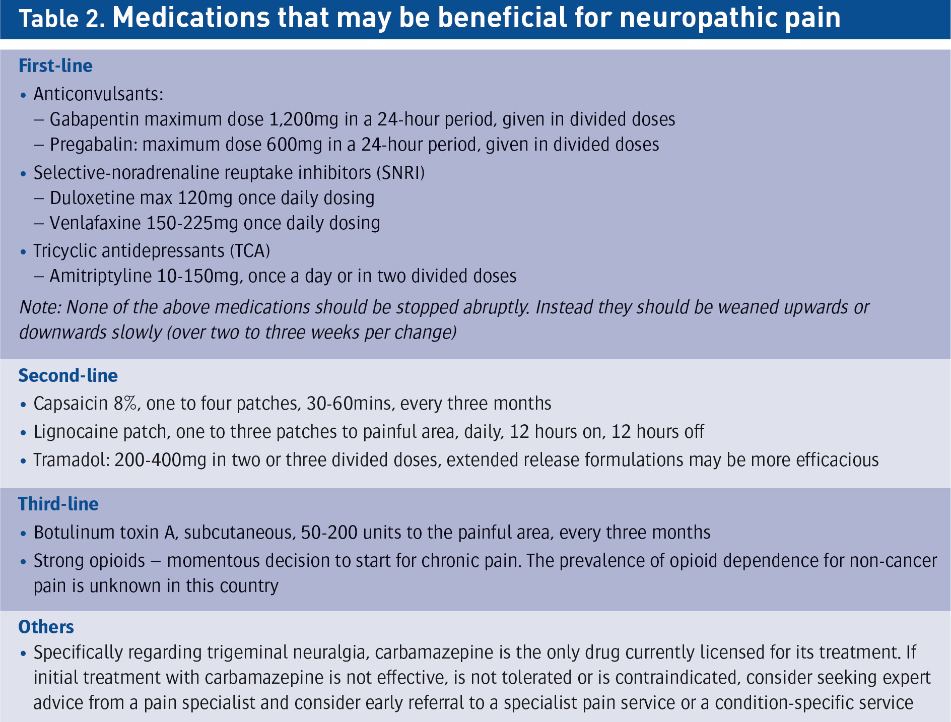Clinicians should also discuss how therapy should be discontinued if the benefits do not outweigh the risks. Medications that may be beneficial in the management of neuropathic pain are set out in Table 2.