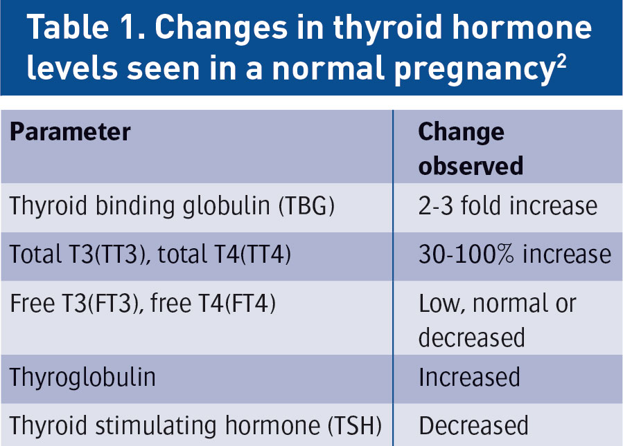 • Pregnancy encompasses a range of physiological changes in the female body. Even in a healthy female, the workings of the thyroid gland are significantly altered with conception, producing a picture that in a non-pregnant female would be pathological. Missing an abnormality in the functioning of the thyroid during pregnancy can have devastating consequences for the developing foetus,1 hence there is a vital need to have adequate systems in place for the early identification of these patients and their timely and effective management (see Table 1).