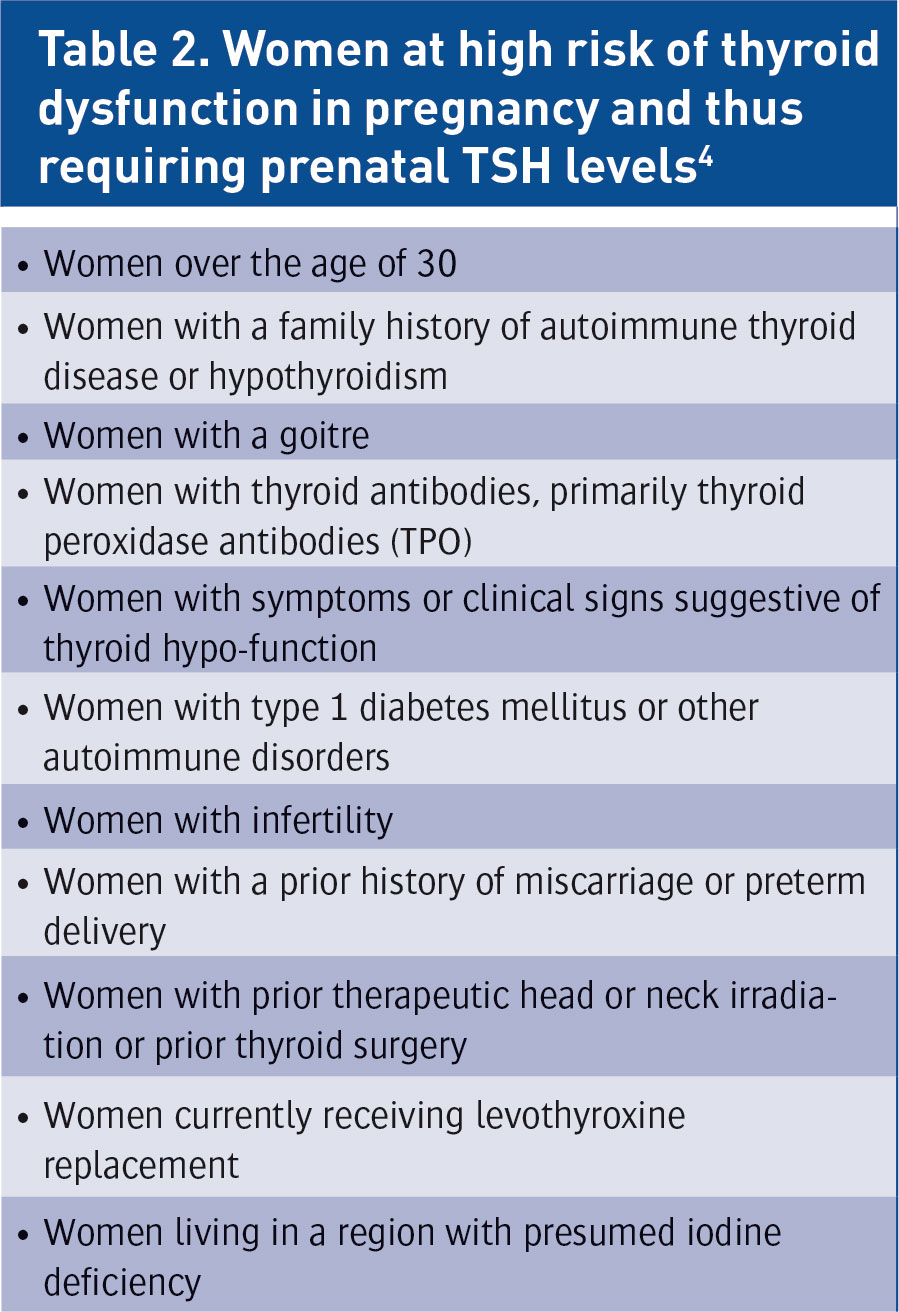The tests used to assess for thyroid dysfunction in pregnancy and postpartum are the same as those in non-pregnant populations, ie. TSH, T4 and T3 levels, however in assessing the results of these tests, trimester and method specific reference intervals need to be applied.7 Large scale screening of all women prior to pregnancy is not currently recommended.4 By nine weeks of gestation, TSH, T4 and TPO levels should have been assessed in all pregnant females.7 Table 2 shows high risk groups who require prenatal TSH levels.