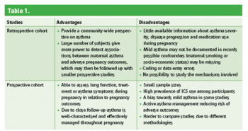Studies assessing the effects of asthma on pregnancy are mostly cohort studies, more commonly retrospective. Advantages and disadvantages for both are summarised in Table 1. Less frequently, cross-sectional surveys, case series and case-control studies are conducted.