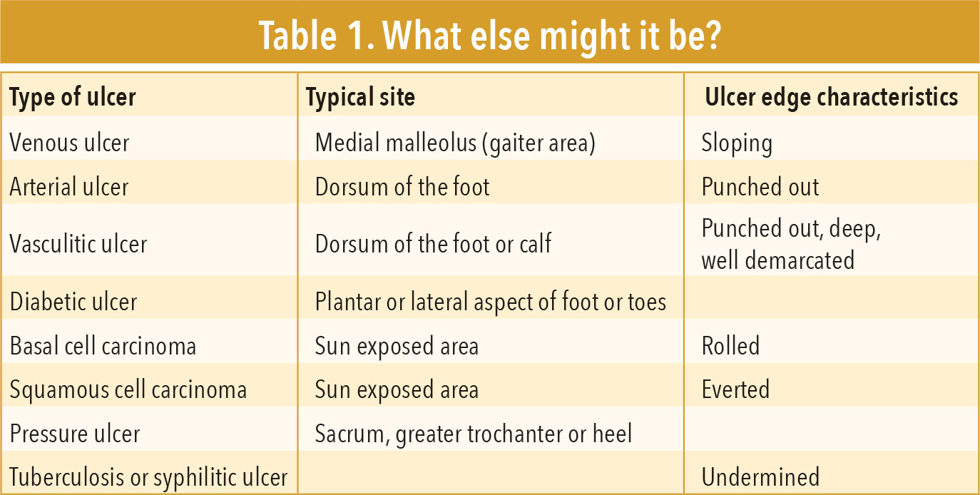 • A suspected alternative cause of ulceration such as arterial or mixed venous/arterial ulcer, suspected malignant ulcer, rapidly deteriorating ulcer, cellulitis, osteomyelitis or sepsis, atypical appearance or distribution of ulcers