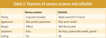 Table 2 outlines the features of venous eczema and cellulitis. If there is no clinical improvement, or allergic contact dermatitis is suspected, refer the person to a skin specialist. Common skin sensitisers include wool alcohols (lanolin), topical antibiotics, topical corticosteroids, cetyl stearyl alcohols, parabens and rubber mixes.