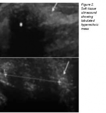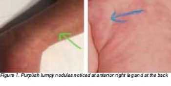 On day 12 of life, the SCBU nurse noticed a palpable, non-tender purplish coloured lump measuring (2 x 3cm) at the front of right leg (shin), one lesion (2 x 2.5cm) on the upper part of back (see Figure 1) and two (0.5 x 1cm) each on right buttock. Hypercalcaemia was noted as an incidental finding during blood investigation for neonatal jaundice. Total adjusted and ionised calcium levels were raised and parathyroid hormone (PTH) was normal. The renal ultrasound was also reported as normal. The baby was started on a low calcium formula (LoCaSol) after a dietitian review. His vitamin D supplements were stopped for a while. Calcium levels normalised after three weeks and the lump self-resolved after two months.