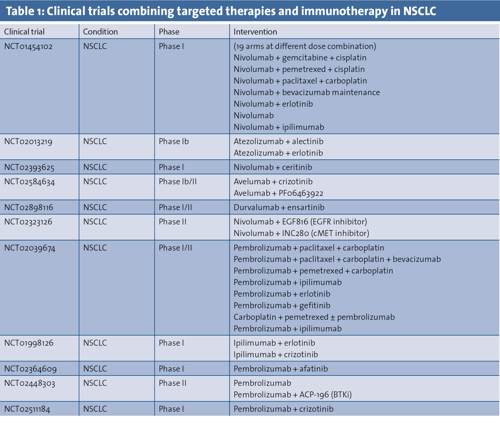 For example, the EGFR mutation has been shown to mediate immune escape through the upregulation of PD-1 and PD-L1 in lung cancer27 and treatment with EGFR inhibitors reduced PD-1 and PD-L1 expression.28 These data have been instrumental in the establishment of several clinical trials focusing on the combination of EGFR and PD-1 inhibitors (highlighted in Table 1). However, it is too early to predict the outcome of this strategy and we are mindful that this constitutive expression of PD-L1 is a result of an oncogenic event as opposed to adaptive immune expression. Therefore, while blocking this driver mutation might downregulate the expression of PD-L1 in the tumour, it remains unclear what the consequences are in tumours that lack infiltrating lymphocytes, which is more common in EGFR mutant NSCLC.29