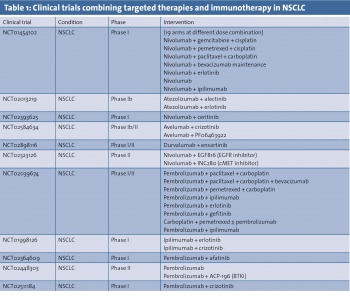 Targeted therapies such as EGFR, ALK and ROS1 tyrosine kinase inhibitors (TKIs) switch off specific aberrant signalling pathways that are crucial for tumour growth and maintenance; whereas immunotherapy harnesses the endogenous immune system to mount an anti-tumour response. Recent clinical trials of immune-checkpoint inhibitors (ICPIs) targeting CTLA-4, PD-L1 or PD-1 have shown remarkable clinical efficacy in the treatment of metastatic lung cancer. However, only approximately 30% of patients respond to immunotherapies. Initial evidence with combined inhibition of PD-1 and CTLA-4 has highlighted the potential of combining agents with synergistic mechanisms of action. Targeted therapies and cytotoxic agents also modulate immune responses, which raises the possibility that these treatments might be effectively combined with immunotherapy to improve clinical outcomes for patients with lung cancer.