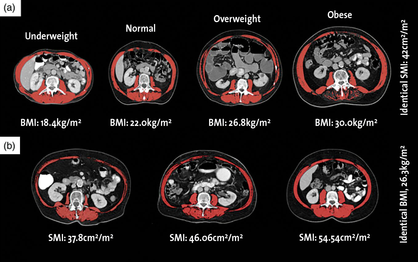 Figure 1(a) shows four male sarcopenic patients with identical skeletal muscle index (SMI) ranging across different BMI categories. Figure 1(b) shows three female patients with identical BMI but varying SMI. Muscle depicted in red in all images.(click to enlarge)