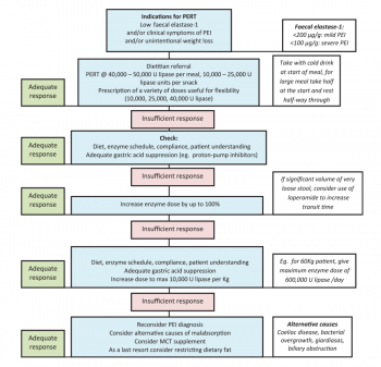 Acid-suppression medication may also be required8 as pancreatic enzymes are destroyed at a low pH. Regular and detailed dietary assessment is vital to ensure appropriate and adequate PERT usage and to ensure compliance. Intervention by a pancreatic dietitian is considered essential.11,12Figure 1 details the management of PEI in CP.1