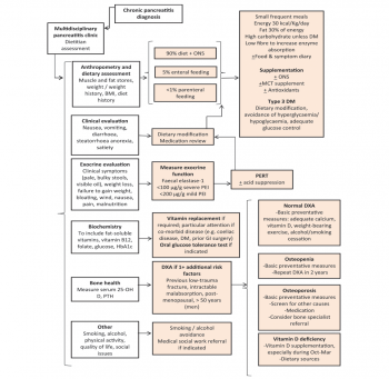 Chronic pancreatitis (CP) is a progressive inflammatory disease which results in the gradual destruction of pancreatic tissue and progressive exocrine and endocrine dysfunction. The nutritional management of patients with CP tends to be problematic. Issues of concern include vitamin deficiency, osteoporosis, brittle diabetes mellitus (DM) and malabsorption – all of which increase morbidity and affect quality of life (QoL).