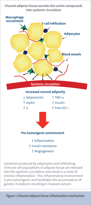 Despite an expanding body of epidemiological evidence in support of the link between obesity and cancer, the underlying molecular mechanisms responsible are poorly characterised. Excess adipose tissue results in elevated levels of pro-inflammatory adipokines, resulting in an imbalance between increased inflammatory stimuli and decreased anti-inflammatory mechanism leading to persistent low-grade inflammation.3-5